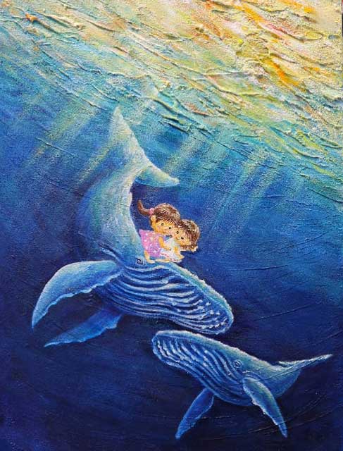 ザトウクジラに人物がのったモチーフの可愛らしい絵のご注文を承ります。